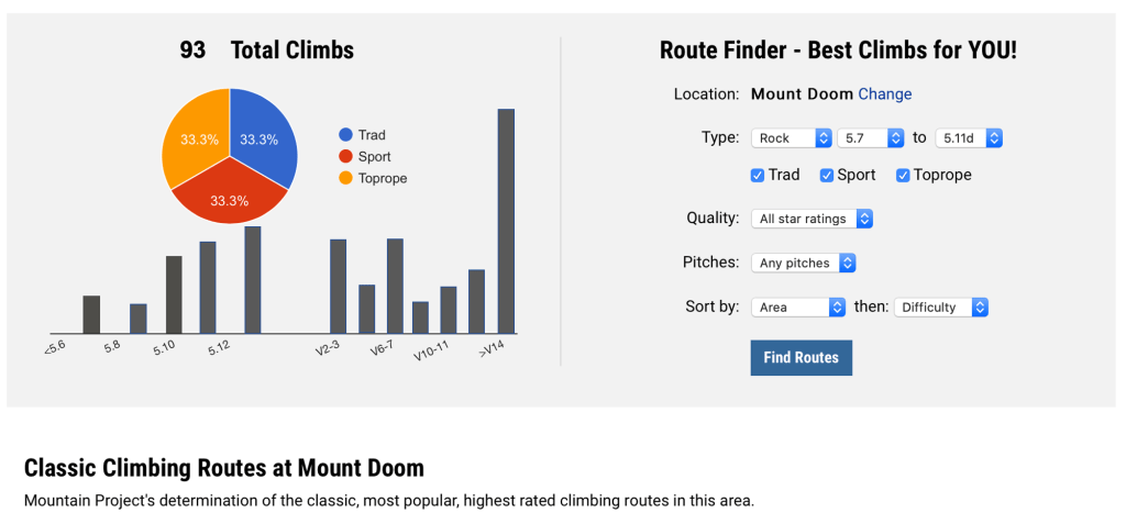 Mount Doom is located in the Plateau of Gorgoroth in northwestern Mordor. It is connected to Barad-dรปr through the steaming fissures of Sauron’s Road. It stood about 4,500 feet with its base about 3,000 feet tall. Mount Doom had an enormous eruption, sending massive lava floes down its sides and scattering the area with volcanic debris.1 The eruption created an extensive boulder field surrounding a pristine wall featuring various styles of climbing.