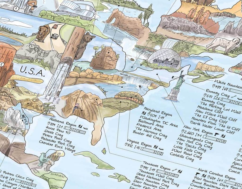 The map itself depicts crags all over the globe.  It comes with beautiful pieces of artwork representing locations from The Santiago Region all the way to Fontainebleau.  From the Grampians all the way to your neck of the woods.