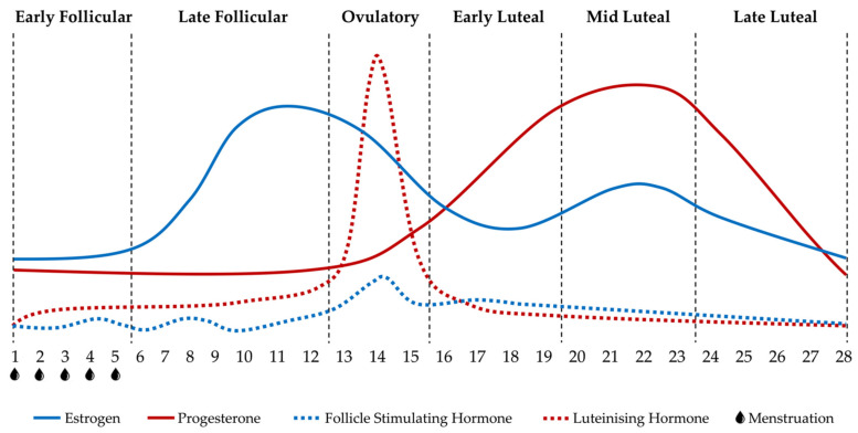 Here is a plot from NIH depicting the 5 phases of a menstrual cycle (MC):