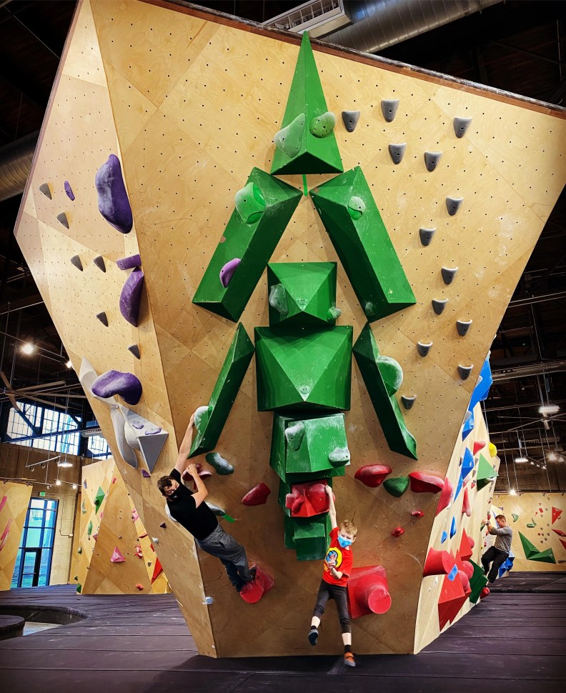 Whoa! That is a lot of holds. It’s one thing to make a boulder route composed of holds, but this must be lose to being a 30-foot Christmas tree. The trunk alone must be 5-feet tall. If you look closely, you can even see colorful holds sprinkled in along the way to represent Christmas lights. There are probably over 200 holds on this mammoth tree and a thousand ways to send. The amount of time and energy it took to put this tree up is off the charts. Plus, they didn’t use trash holds on this tree, these are really nice holds, meaning there probably isn’t another green route in the entire gym. Planning and energy went into this piece. This is more than just a route; this is a piece of festive interactive art! We salute you Bend Rock Gym, thank you for the fun!